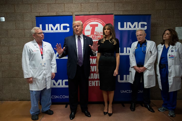 Sure enough, in Las Vegas on Wednesday, Trump followed in that style. After visiting the University Medical Center along with Melania and meeting with survivors, Trump spoke to the press. He began by praising the medical professionals, first responders, and survivors of the shooting.