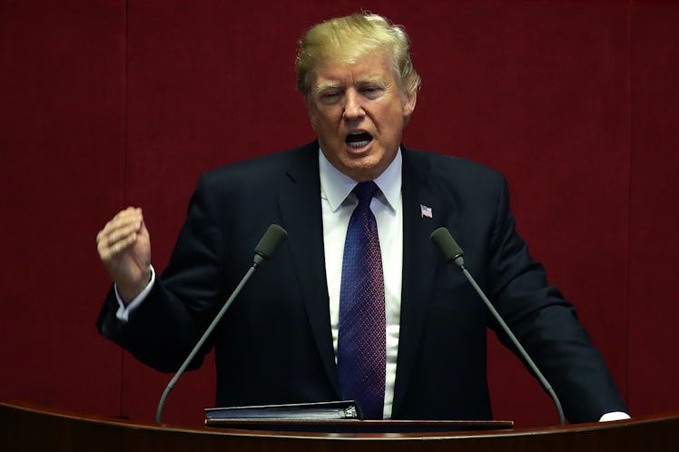 During a speech before South Korea's National Assembly, Donald Trump talked about North Korea in a way that differed from his past comments about the U.S. adversary. The president was relatively measured, trading in catchphrases like "little rocket man" (which he has used to refer to North Korean leader Kim Jong-un) for more diplomatic terms to describe the U.S.' position: "I want peace through strength." Then came Trump's warning to North Korea, in his more usual blunt fashion: "Don't try us."