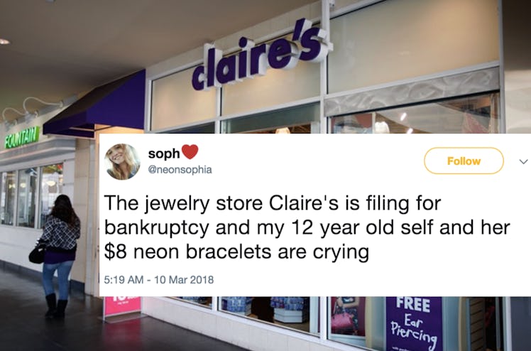 Every time I set foot into a Claire's store, waves of nostalgia immediately carry me back to the early '00s. Coming in clutch with those free ear piercings, classic BFF heart necklace sets, colorful tutus, and almost every single flavor of lip balm known to man (and woman), Claire's was an accessory paradise for anyone and everyone (especially my third grade self). However, our go-to childhood store will apparently file for bankruptcy, according to reports. These tweets about Claire's reportedly filing for bankruptcy will truly tear you apart.