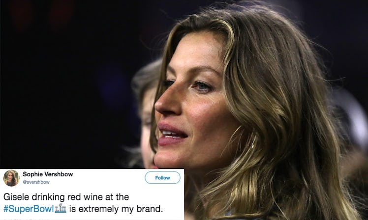 Gisele Bündchen is officially the world's most relatable supermodel millionaire married to a hot, famous quarterback. While her husband was all riled up about the big game, she sat casually with her daughter, looking a little over it, drinking red wine out of a stemless glass. Tweets about Gisele drinking wine during the Super Bowl prove that she's literally all of us — just a girl who wants a good drink on a chill Sunday night.
