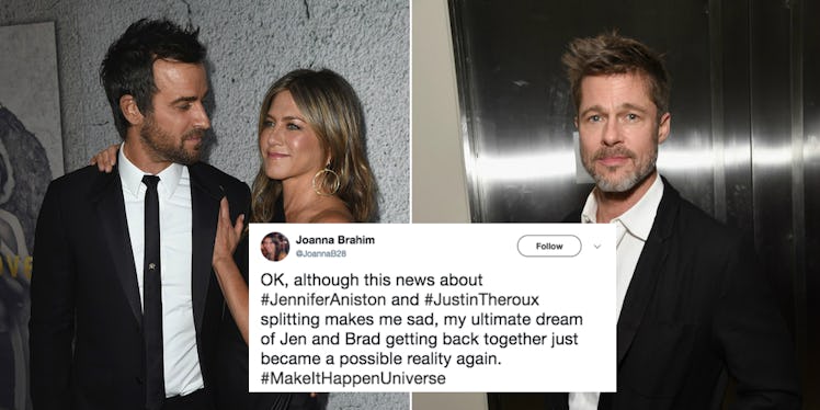 You know what that means. If you're seeing stories and rumors floating around about Theroux or Aniston that they haven't said themselves (*ahem* like Pitt and Aniston getting back together), then you can rest assured they're probably false. Buuuuuuut that didn't stop Twitter from going HAM on playing around with the idea of a Brad-Jen reunion.