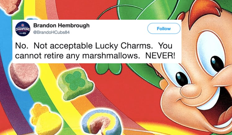 Other Twitter users aren't so upset over the fact that the hourglass 'mallow is going into retirement, as much as they're worried that its absence will totally ruin the classic Lucky Charms jingle. Retiring the hourglass will, in fact, create a random gap in the classic song — and certain jingle-loving fans are just hoping that General Mills will step up and find another four-syllable shape to take its place to keep the song going. Because, as we all know, ruining the Lucky Charms song would be a serious travesty.
