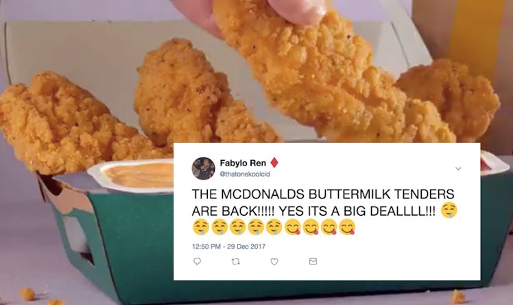 Even if you're super stoked to snack on McDonald's Buttermilk Crispy Tenders ASAP, you can still enjoy the Buttermilk Crispy Tenders even after you ring in 2018. McDonald's announced the good news on their Twitter page on Thursday, Dec. 28 in a video tweet where they said, "The #ButtermilkCrispyTenders that you love so much have returned!"