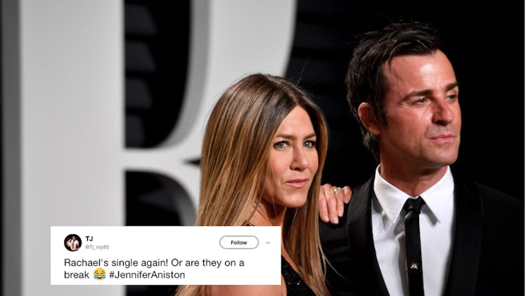 Jennifer Aniston and Justin Theroux announced on Feb. 15 that they are separating after two years of marriage, and suddenly, it feels like we are all living in a previously-unaired Friends episode called "The One Where Jennifer and Justin Are On a Break." Because after the couple confirmed the split via a joint statement, Twitter exploded with references to the infamous Ross/Rachel era that started when Ross hooked up with the hot girl from the Xerox place — and the resulting tweets about "on a break" jokes are actually hilarious.