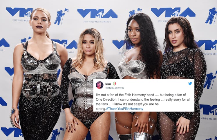 Fifth Harmony is officially done. The group announced on Twitter on Monday, March 19, that they're going on a hiatus "in order to pursue solo endeavors," aka they're most likely breaking up for good. While the statement hints the girls could one day get back together, fans don't think it's likely, seeing as One Direction implied the same exact thing when they went on their "hiatus" in March of 2016. Fast forward two years, and they're still not back together. Now, 1Ders are showing support for Harmonizers after the group's announcement, and the tweets about One Direction and Fifth Harmony show not only the parallels between the groups' respective breakups, but also how the fans are coming together to support each other following Monday's announcement.