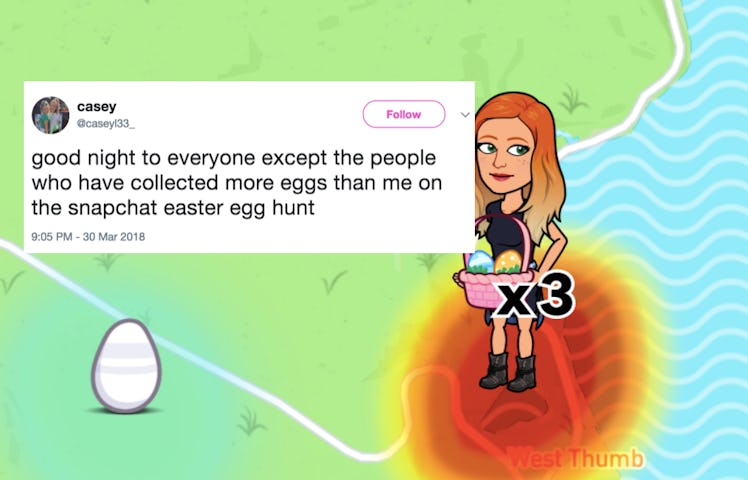 In case you haven't yet heard about what the "Great Snapchat Egg Hunt" is egg-stactly, it's an Augmented Reality (AR) game that officially started on Friday, March 30, via Snapchat's Snap Map. Upon opening the Snap Map on your phone, you'll notice it's decorated in tiny pastel-colored eggs. The goal is to physically go to the locations of the cyber eggs and collect as many as possible before 9 p.m. PT on Sunday, April 1. If you ever hopped on the Pokemon Go! train, the concept is pretty similar, because eggs will be lying around in stores, coffee shops, and public parks. It's not a race, though, because the same eggs show up in all the same places for everyone, regardless if someone else gets to it first. Ultimately, you'll want to collect all of the eggs on your local Snap Map by Sunday evening.