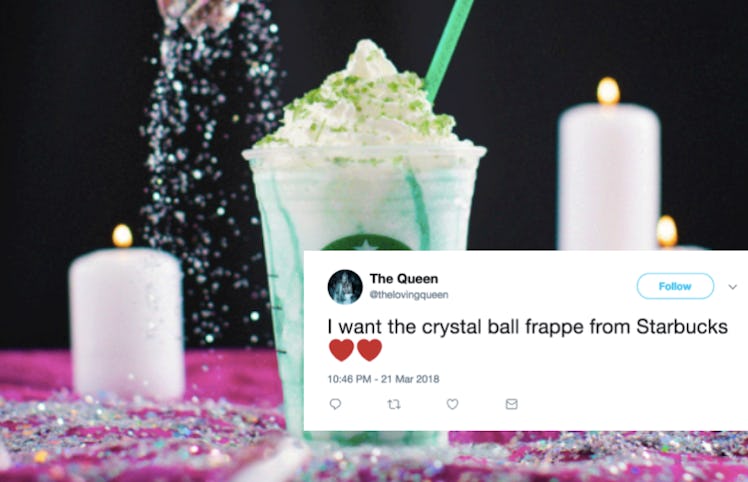 After waiting for far too long, my crystal ball is showing that the ever-elusive Crystal Ball Frappuccino has finally been announced — and it'll arrive at Starbucks on Thursday, March 22. Whether you tend to order Starbies through the app or via telekinesis, though, get it ASAP — it's only going to be available for four days, while supplies lasts. And unless you've already telepathically communicated with the entire Twitterverse, here's what they think about the mystical new Starbies creation.