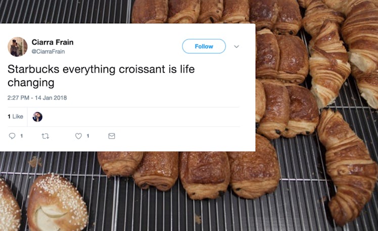 Most people have a go-to Starbucks order. Mine, for example, is usually one small soy latte and one Spinach Feta Wrap. But alas, it can change. Every time Starbucks comes out with a new menu item, my ordering patterns go totally out of whack, and I need to completely reconsider my options to avoid major Starbucks FOMO. So if you're willing to branch out and try something new, the tweets about Starbucks' new Everything Croissant might convince you to reconsider that regular order of yours.