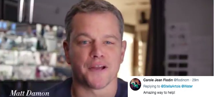 It's Sunday, Feb. 4, and the 52nd Super Bowl at U.S. Bank Stadium has kept us on our toes — along with all of the highly-anticipated commercial breaks. From Pink singing the national anthem and Justin Timberlake's epic halftime show, there are many things we've been looking forward to for this year's Super Bowl. In the midst of all of the commercials, tweets about Stella's Super Bowl commercial with Matt Damon show fans are already behind the powerful messages that came with a few of the ads this year. This Stella Artois ad, in particular, hit the Internet a couple of weeks ago, and the meaning behind it will make you want to get involved as soon as you possibly can.