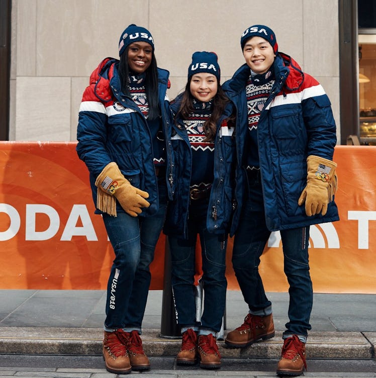 Ralph Lauren designed this year's opening ceremony outfits for Team USA. The American athletes are decked out in intricately knit sweaters, "USA" pom pom beanies, embroidered jeans, lace-up boots, and heated parkas, but the most eye-catching part of the outfit is the fringed gloves. The rest of the looks are red, white, and blue and patriotic AF, but the gloves are the focal point. The front is beaded with an American flag and the five Olympic rings, the body of the gloves are brown suede with fringe cascading down the side. Ralph Lauren as a brand is known for its Americana, western-inspired designs, but Olympic fashions are notorious for highlighting a country's official colors, so people were taken aback by the beige hand coverings.