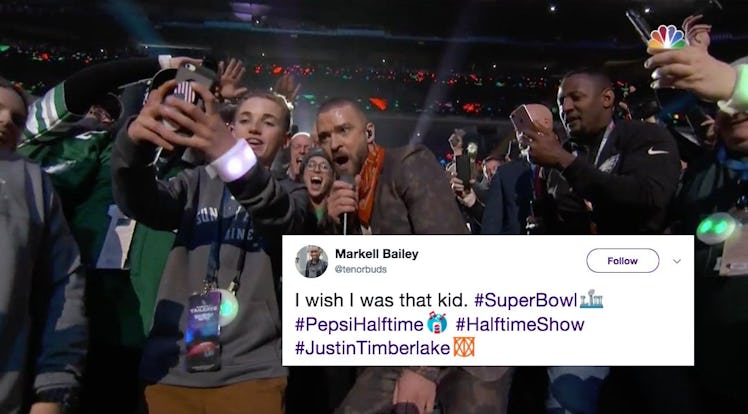 Justin Timberlake just gave the 2018 Super Bowl halftime show everything he had. He sang all the hits, delivered all his signature dance moves, and even jumped into the audience for a bit. One person we all couldn't take our eyes off of was the kid during Justin Timberlake's Super Bowl performance. I think extreme jealousy was the emotion we were all feeling. He was right in the action, and got the selfie of a lifetime.