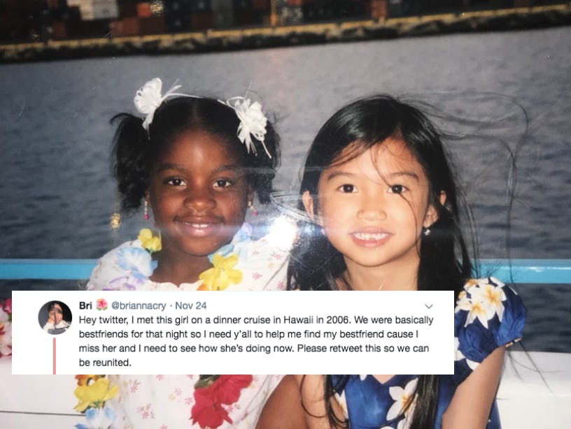 Hey twitter, I met this girl on a dinner cruise in Hawaii in 2006. We were basically bestfriends for that night so I need y’all to help me find my bestfriend cause I miss her and I need to see how she’s doing now. Please retweet this so we can be reunited.