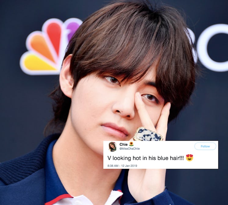 On Jan. 12, BTS performed at the Nagoya Dome in Nagoya, Japan where some of the BTS boys debuted new hair colors. Jimin threw it back to older BTS eras with a cotton-candy pink hair, Jin was sporting a dusty greyish-brown, and Suga had a blueish-grey 'do. Understandably, fans everywhere were absolutely overwhelmed by all the newness (and hotness) on stage and expressed their adoration for the BTS antics on Twitter. One user, @tkyohoe, tweeted, "[P]resent day bts: the BEST hair colours they've ever had." Another fan, @AnaAleSanchez, tweeted, "[W]oooow I woke up and bts really is out here attacking me with new hair colors." But fans were obsessing with V's blue hair in particular because of how incredibly good the color looks on the K-pop star.