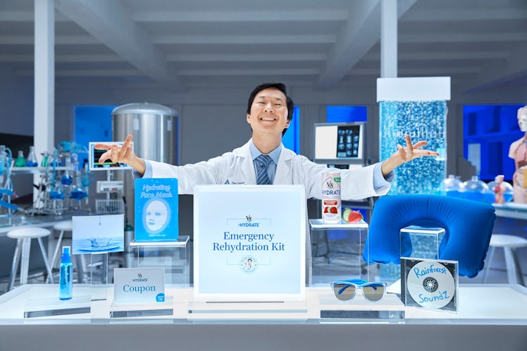 You're probably somewhat familiar with Dr. Ken Jeong from The Hangover. (You know, the iconic scene when he popped out of the trunk naked?) But what you might not know is that he is a licensed (but not practicing) doctor, who recently became interested in conducting rehydration experiments to honor The Hangover's 10-year anniversary. According to V8, at the "Center For Hangover Research," Jeong tested pickle juice, applesauce, electricity, and more, on millennials (ages 21 and up) who needed a lil' rehydration, according to the brand. And from a medical standpoint, they, well, weren't totally valid. But nevertheless, he persisted, and the tests inspired the world’s first Dr. Ken-approved Emergency Rehydration Kit. TBH, as soon as they're released on May 30, I'm getting one for myself.