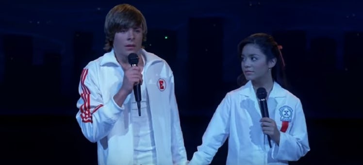 Kicking off with Hudgens in a lab coat and even shooting a nervous glance at a Kelsi equivalent on the piano, the "Lay With Me" music video certainly isn't trying to be sneaky with its parallels of High School Musical. In the movie, both Troy and Gabriella rush to their final callback for the school musical after their friends thwart the timing of the basketball game and the academic decathlon, allowing the two to make their audition. When the crowds from both events flood into the auditorium, Gabriella freezes, never having performed in front of a large audience. Troy's mere presence comforts her enough for her to tentatively begin singing "Breaking Free," but soon, they're living their best lives onstage.