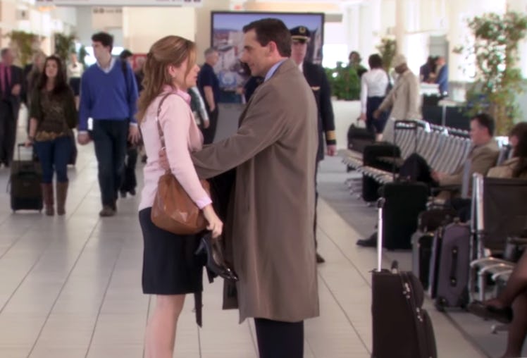 In the Season 7 episode "Goodbye, Michael," Michael decides to leave Scranton for Colorado a day early, so Pam misses her opportunity to say goodbye because she's out running an errand. When Jim learns that Michael is leaving earlier than expected, he drives Pam to the airport to make sure that she and Michael can share a final moment together. At the end of the episode, fans see Pam holding her shoes (he was on the other side of security already) and running towards Michael. They hug, and he kisses her on the cheek like a loving father before grabbing his suitcase and walking away. It's a super sweet moment, but of course, without sound, fans were left in the dark about what they actually said to each other at the airport — until now.