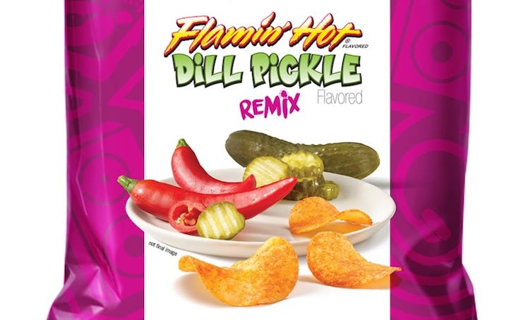 If you need further clarification on the new chip flavor, let me put it this way: Lay's Flamin' Hot Dill Pickle Remix chips taste like the Lay's Flamin' Hot and Lay's' Dill Pickle flavors had a baby. If you've tried both of those options, then you can probably imagine how they'd taste combined with one another, or "remixed."