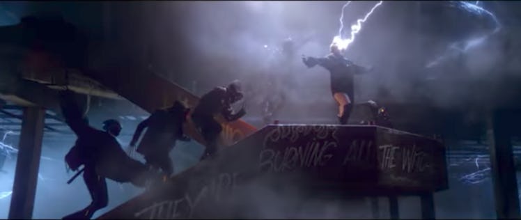 I swear, there is nothing you can sneak by Swifties. The words "they're burning all the witches" appear as graffiti on a ledge during literally the last second of the teaser. The scene features Swift blasting some lightning out of her face (mouth?) while three soldiers (robots?) are coming after her. Like I said, it's literally one second, and there are so many unanswered questions.