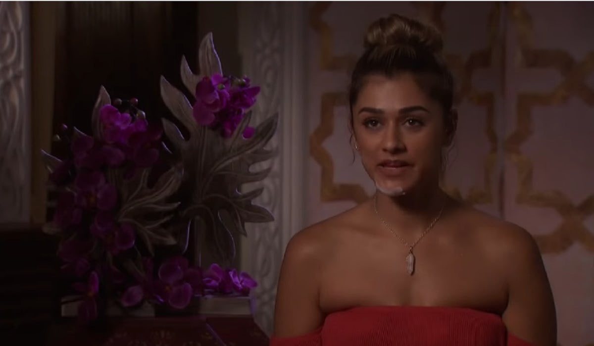 As she explains to the cameras in the deleted Bachelor scene, Kirpa was trying to take a photo in front of the ocean when she forgot that it had rained, making the nearby rocks wet and slippery. "Went to step on a rock, slipped, went to catch myself with my hand, and then instead my chin took the fall," she says in the footage. "Five stitches later and a sprained wrist, and here I am!"