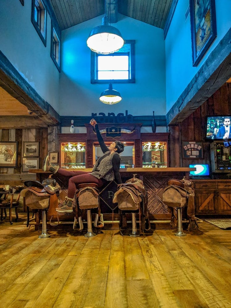 On the last night at The Ranch at Rock Creek, I had so much fun in the resort’s Saloon, shooting a few games of pool, playing a rousing game of bowling and even grabbing a drink at the bar by climbing on top of the saddles that replaced the bar stools.