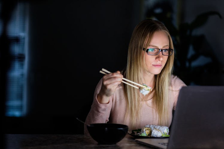 But here's the thing: Per sleep doctor and creator of Nightfood, Dr. Michael Breus’ findings, if you typically eat food that’s very lean and super healthy during the day (which, yay for you), you’re probably going to end up craving and eating sugar at night, just because your body is reacting to the lack of carbs and sugars during the day. It makes sense, right? Breus also tells Elite Daily that your body craves foods that are high-fat and high-calorie at night because these are the types of foods that "produce serotonin [the neurotransmitter that makes you sleepy] to help lower [the stress hormone] cortisol." In other words, late at night, your body sort of mimics a bear going into hibernation mode: It’s going to want to stock up on calories, and sugars, and all those good-yet-not-so-great food groups, for the simple fact that it just "doesn’t know when you will eat again," Breus says.