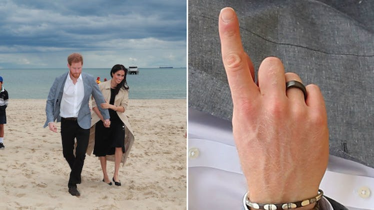 If you've been following the Prince Harry and Meghan Markle love story every step of the way, then you've probably seen the black ring on Harry's right hand ring finger that's been popping up in pictures recently. Since I consider myself something of a sleuth, I thought the ring might have something to do with the royal couple's recent baby news. But the actual meaning behind Prince Harry's black ring, called the Oura Ring, is less symbolic and more functional than that.