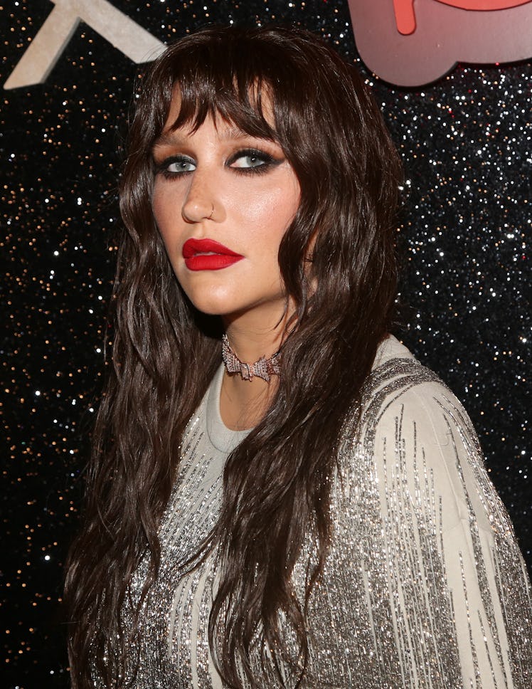 The promo photos are stunning, featuring a dark-haired Kesha with lilac eyes and a red lip: