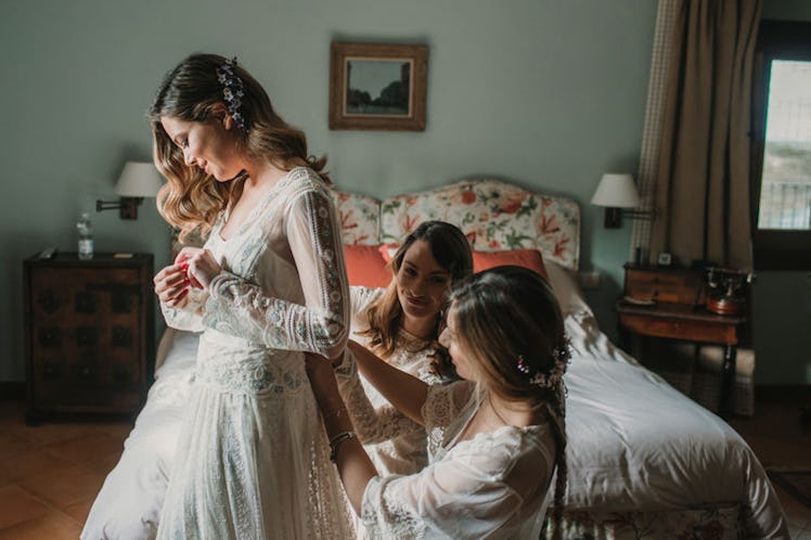 On the day of the wedding, the bridesmaids typically get ready with the bride. They retreat to a suite in a dreamy hotel, where a hairdresser and makeup artist have their brushes and palettes set up. From there, they spend the next hour or so getting pampered and prepped.
