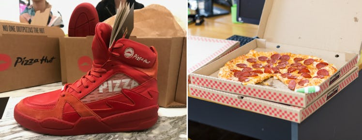 Have you ever wanted to order pizza at the press of a button? Have you also always wanted pizza-themed footwear? Well, now you can have both of those things all wrapped up into one beautiful shoe: Here's where to buy Pizza Hut Pie Tops sneakers, so you can order your pizza and eat it, too.