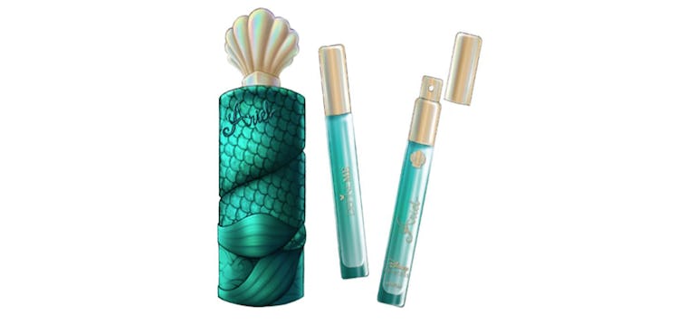 The mermaid-inspired perfume will be available in two sizes: a 75 milliliter bottle and a 9 milliliter travel-size bottle. The larger perfume bottle looks just like Ariel's fins with metallic green scales covering the bottle. It has the name "Ariel" etched in cursive at the top of the bottle and is capped off with an iridescent seashell top. The smaller travel-size bottles are a light, iridescent teal and have an iridescent pearl-colored spray top.
