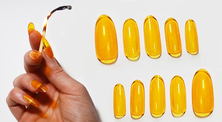 Whereas Childhood Me would've positively *died* if you could see my actual nail through a non-opaque polish, the jelly nail trend plays up a cool, transparent look, and I really like it. Within seconds of scrolling, I was already on the brand's site ready to buy a pair and try them for myself. Should I opt for "Ghost," the almost completely clear, lavendar-tinted set? What about "Slime," done in a transparent neon green? Overwhelmed with possibilities, the decision became a thousand times easier when I discovered the Fyre_Fest Orange Juicy Jelly Set ($15, digitsdigits.com), a 20-piece set of acrylics that not only looks fab, but also gives back.