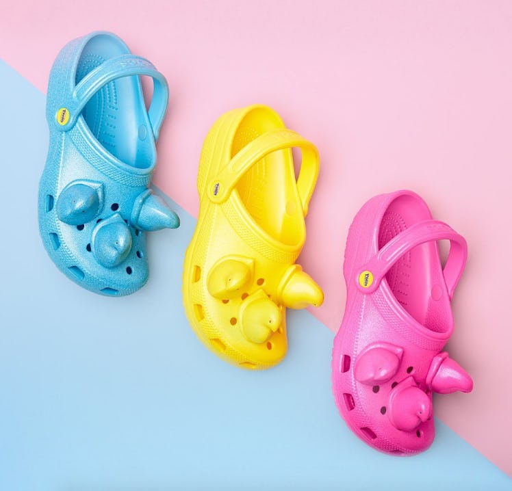 Announced on Crocs' Instagram on Thursday, Feb. 27, the collaboration includes special-edition Crocs' Classic Clogs in three springy colorways: baby blue, bright yellow, and hot pink. Definitively more exciting than any part of this collection, though, are the color-coordinated, Peeps-shaped Jibbitz charms. Never in a million years did I think I'd actively pre-check my bank account to make sure I had enough money to buy three pairs of Crocs with Peeps coming out of them, but there's a first for everything.