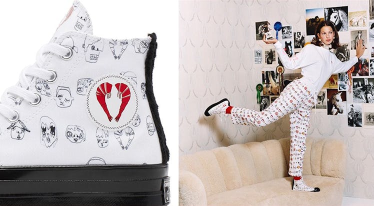 The collection dropped on December 13 and is available exclusively on Converse.com and the Shrimps E-boutique. It's not a huge line of pieces; in fact, there are only two sneakers in total. In addition to the kicks, though, the collab includes a hoodie, a pair of pants, and two long-sleeved shirts, so if you wanted to, you could really rock a Shrimps X Converse look from head to literal toe. The price range sits between $45 and $120, and according to the brand, each piece is covered in designs of hand-drawn doodles by Weiland herself.