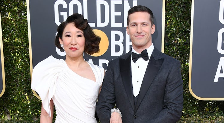 Here's Andy Samberg rocking his black bracelet alongside his co-host, Sandra Oh:
