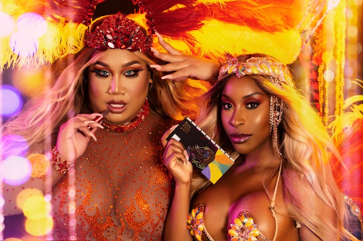 Fans of the beauty gurus have been waiting for an Aina and Starrr collab ever since Starrr posted his transformation into Aina in August 2019. Both YouTubers have collabed with makeup brands before (Starrr for MAC and Aina for Anastasia Beverly Hills, to name a couple), but fans haven't really gotten to see them work together until now. In their campaign images, the gurus are decked out with matching yellow, orange, and red feathers in bona fide Carnival costumes. As far as makeup goes, the two showcase different shades of red eyeshadows and both of their faces look like sparkling glass with the bronzer highlighter.