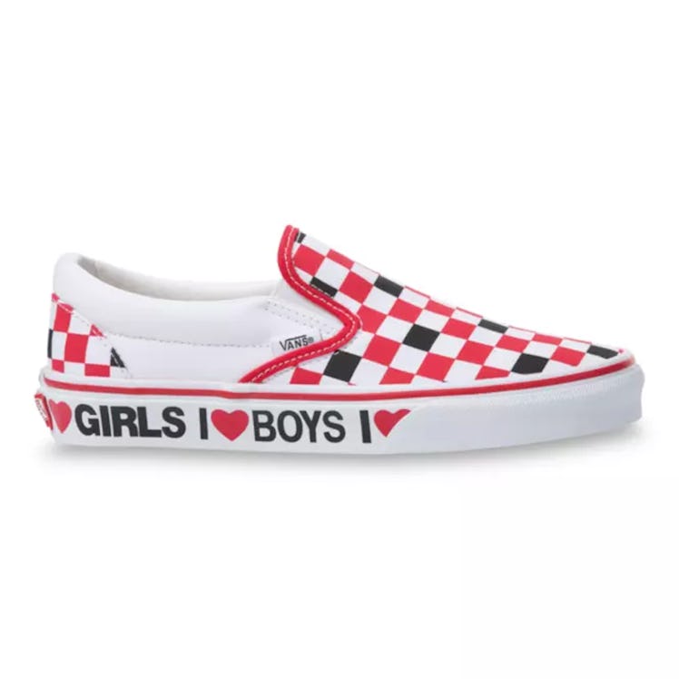 The Slip-Ons feature Vans' signature checkerboard print with red, white, and black squares; the "I ❤ Boys, I ❤ Girls" text around the sole; and elastic side accents so you can smoothly slide your foot in — just as smoothly as you should slide into your crush's DMs on V-Day.