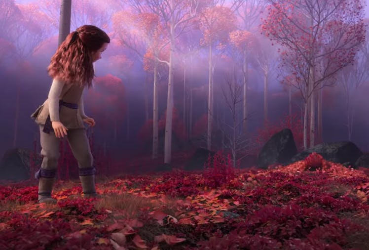The trailer doesn't offer many specifics about the plot of the new movie, but it does set a truly epic tone. The first movie's main characters Elsa, Anna, and Kristoff, set off on what looks like a high-fantasy adventure far beyond the walls of Arendelle. The majority of the trailer features shots of the trio we know and love, along with Olaf the snowman and Kristoff's trusty reindeer buddy, Sven. But, there's also one blink-and-you'll-miss-it scene that offers audiences a glimpse at two never-before-scene characters. While the first movie had an icy blue color palette, the trailer for Frozen 2 shows a much more autumnal-themed landscape. In one of the many fall forest scenes of the trailer, there's a quick shot of a curly red-haired girl turning to watch a blonde boy get catapulted from a pile of leaves. You can spot them at minute 1:24 in the trailer below: