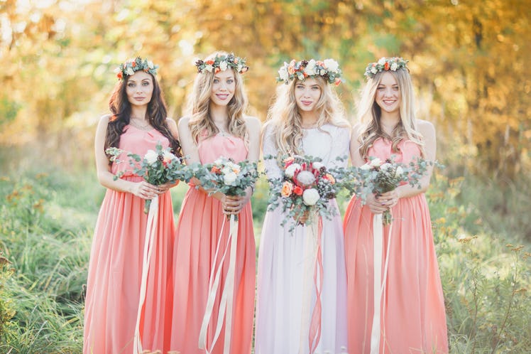 According to Mental Floss, the tradition of matching bridesmaids dresses is actually an ancient one. "Beginning around Ancient Roman times (when the idea of a bridal party first arose), bridesmaids would not only dress like each other, but also just like the bride, covering the altar with nearly indistinguishable ladies. And that was the point: the bridesmaids were decoys." Yep, the tradition of matching bridesmaids dresses was created to ward off ancient wedding crashers — both living, and (wait for it... ) dead.