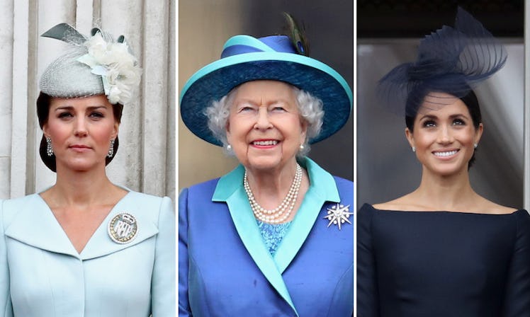 Strap in, royal fanatics. The Queen has a documentary coming at ya and it's packed full of your favorite Queen things. It's called Queen of the World, and in the trailer Queen Elizabeth is seen knighting someone, wearing adorable queen clothing, laughing her adorable queen laugh, and basically just being awesome. She's also spotted hanging out with the new Duchess of Sussex, Meghan Markle. While fans will be delighted to get a peek at the ins and outs of Markle's relationship with the matriarch, a few people are wondering — Why isn't Kate Middleton in the Queen's documentary as much as Meghan? Ya know what, reader? Great question. Luckily, there's also a great answer.