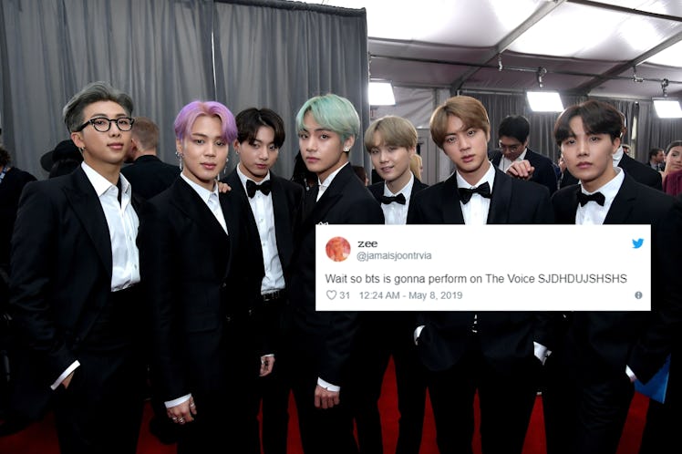 BTS has truly been taking over American TV with performances on shows like America's Got Talent, Good Morning America, The Ellen DeGeneres Show, Jimmy Kimmel Live!, and Saturday Night Live to name a few (and I do mean a few, because those guys have been everywhere lately). Now that the group is in America again for their Love Yourself: Speak Yourself tour, they are confirmed for even more stateside television appearances, including Good Morning America (again) and The Late Show With Stephen Colbert. But, fans are wondering if BTS will be performing on another television program: NBC's The Voice. I know, I know, that's huge. So, will BTS perform on The Voice? Fans are totally convinced they will.
