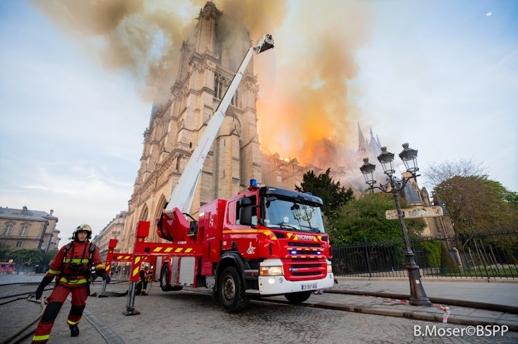 According to the New York Times, more than 50 officials are trying to find the cause of the fire, which still remains unknown, but may be an accident related to construction to restore the cathedral. Some 400 firefighters were at the scene of the blaze, and eventually extinguished the fire at around 9:30 a.m. local time on Tuesday April 16, per The Guardian. Much of the building's interiors and exteriors were damaged in the fire, including many sections made of wood, two-thirds of the roof, and the thin spire atop a tower, which completely collapsed in the flames, according to Huffington Post. Thankfully, much of the historic artwork inside the cathedral was saved, with workers forming a human chain to rescue the cathedral's treasures according to Paris Mayor Anne Hidalgo.