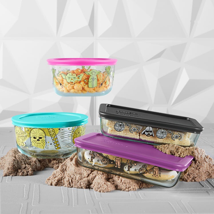 Pyrex released its first Star Wars-themed offerings — which included 4-cup containers featuring doodles of Chewbacca, Darth Vader, and Yoda as well as an 8-piece collection offering a variety of shapes and sizes — back on May 4. The lineup, which ranged from $8 to $36, quickly sold out, and Pyrex followed up with two new offerings depicting the Child from The Mandalorian, aka Baby Yoda, on May 11.