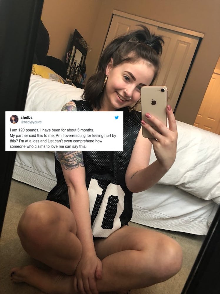 "I am 120 pounds," Shelby wrote. "I have been for about 5 months. My partner said this to me. Am I overreacting for feeling hurt by this? I’m at a loss and just can’t even comprehend how someone who claims to love me can say this."