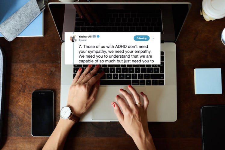 Whenever someone's having a particularly hard time staying focused on a task, it's pretty common for them to say something like, "I'm feeling so ADHD today." While a remark like this might seem like NBD, it can actually come across as insensitive to those who really do have the condition. The truth is, there's a lot that people don't understand about attention-deficit/hyperactivity disorder, and that's exactly why freelance journalist Yashar Ali wrote a Twitter thread about ADHD. In a series of tweets, Ali shed light on some of the most common misunderstandings and challenges that can come with the disorder.