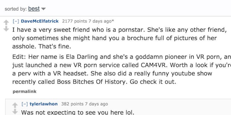 Yeah, so there's a lot of very uncomfortable stuff on this thread. But, occasionally, there's also some pretty hilarious and/or illuminating stuff about the peculiar daily lives of people who the whole world watches do intimate things on the Internet.