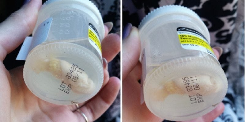 Now for the question you're probably dying to know: Why on Earth does this woman have her toe in a jar?