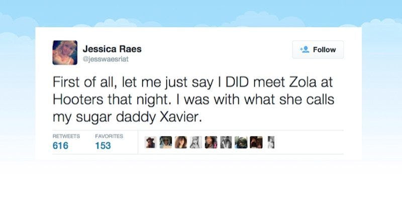 First of all, let me just say I DID meet Zola at Hooters that night. I was with what she calls my sugar daddy Xavier. — Jessica Raes (@jesswaesriat) October 29, 2015