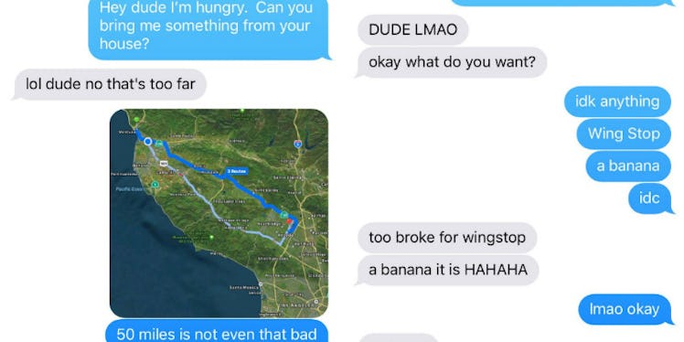 Normally, one would go buy an overpriced sandwich at the Starbucks, but instead he texted his best friend about the situation.