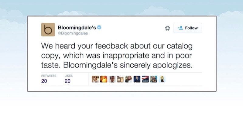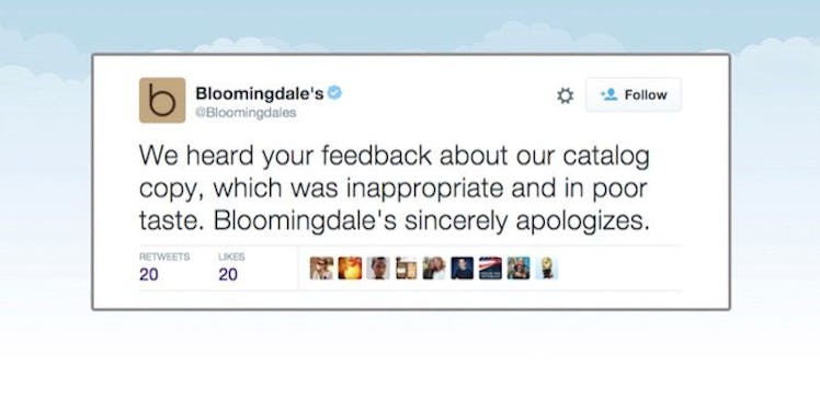 Once the clothier took notice of the backlash, a statement was issued. A Bloomies representative said,