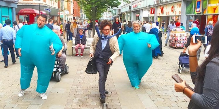 Pure Gym in Manchester, UK tried to grab the attention of prospective costumers by having an employee in a bright blue fat suit stand outside the store. The gym certainly got the attention it wanted, but not for the right reason.